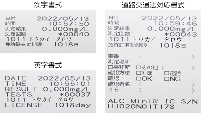 ※測定結果の印字は、漢字・英字・道交法の3つの書式から選択できます。登録者一覧を確認したい場合は、保守モードから印刷できます。
