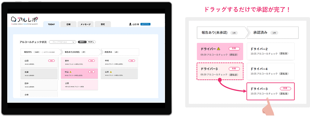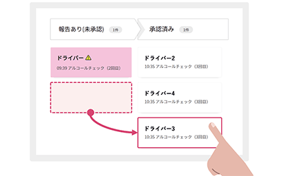 アルコールチェックの報告をカード形式で確認。ドラックするだけで承認完了。