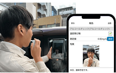 Bluetooth®対応のアルコール検知器と連動。測定中の顔写真をスマホカメラで撮影できるので、なりすまし防止になります。