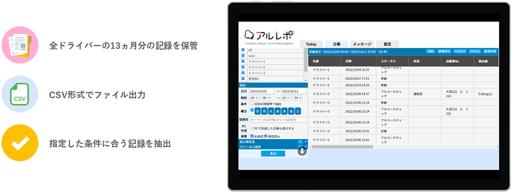 アルコールチェック結果はクラウドに最大13か月記録保存。アルコールチェック義務化規定に対応しています。