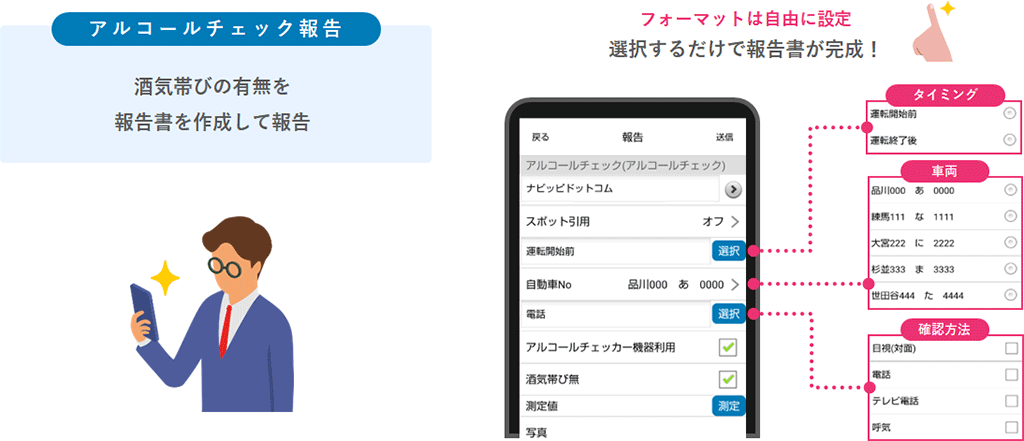 報告書のフォーマットは自由に設定可能。報告する項目を選んで報告完了。