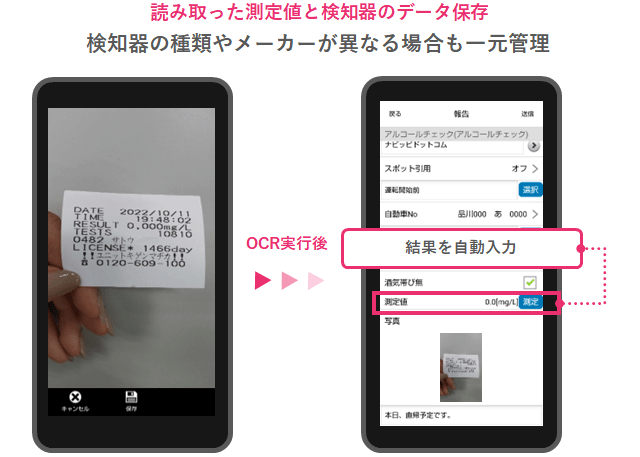 Bluetooth®非対応のアルコール検知器を既にお持ちの場合は、スマートフォンのOCR機能を使って、アルコール検知器のデータをアルレポに送信できます。