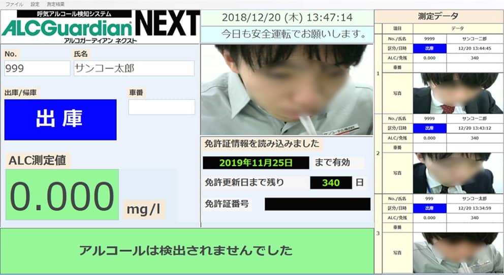 設定不要、パソコン不要ですぐに使える業務用アルコール検知器。顔写真自動撮影、プリンター一体型、音声ガイド付き。