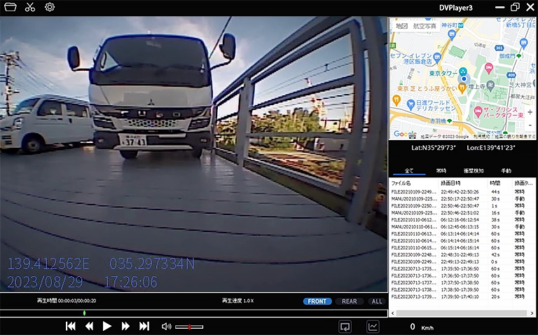 センシングアイで録画した映像は、専用のビューアソフト(無料)で閲覧できます。ビューアソフトでは、GPSによる位置情報や車速情報も閲覧できます。