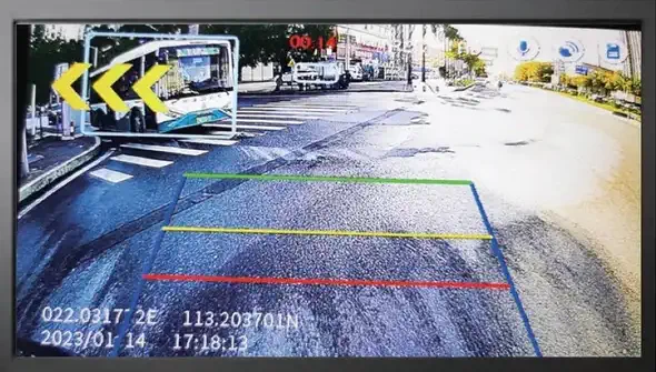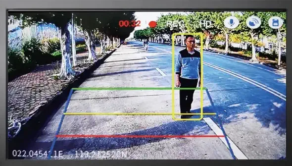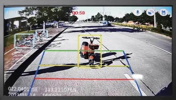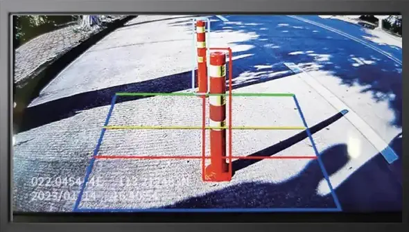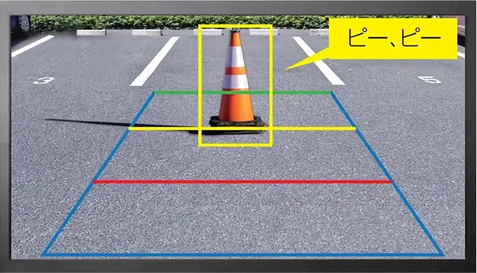 センシングアイは、モニターに映る後方の人・自転車・バイク・車・動物・パイロン・ポール・自動販売機・エアコン室外機等をAIで検知できます。固定物だけじゃなく、移動体も検知できます。