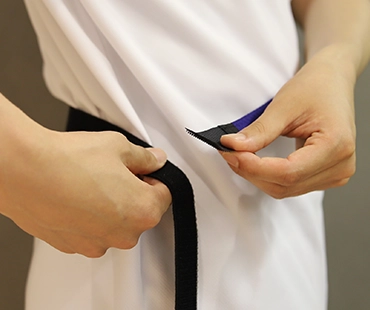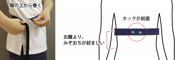 ホックが前面にくるように、服の上から、みぞおち周りにベルトを巻く。(お腹より、みぞおちが好ましい)