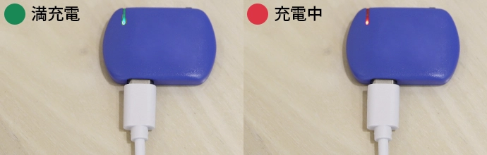 USB Type-Cケーブルで本体を充電します。「緑」ランプは、満充電。「赤」ランプは、充電中。睡眠測定中に充電切れにならないよう確認の上、ご使用ください。
