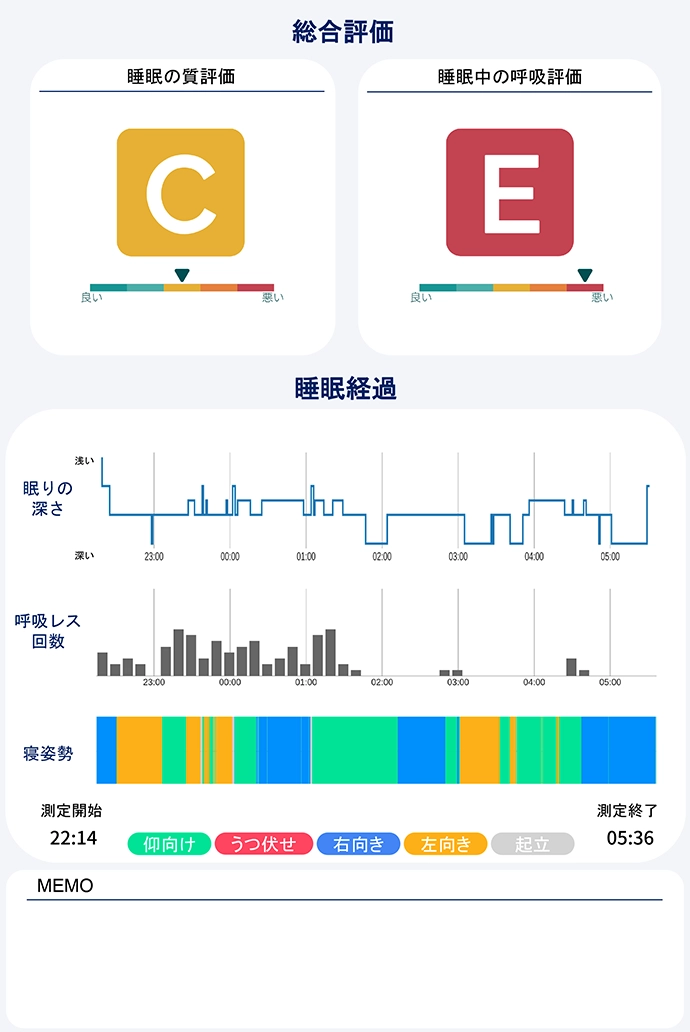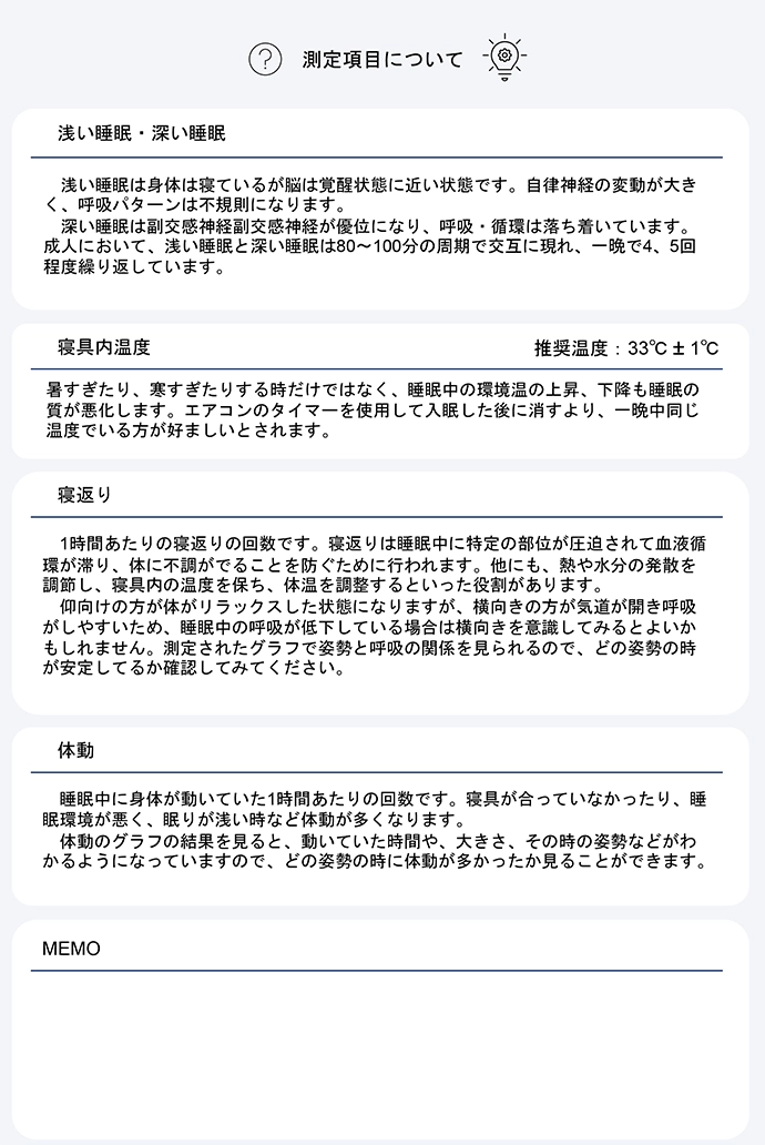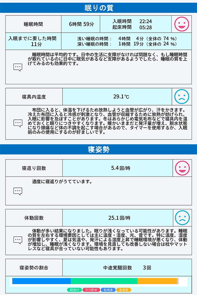- 眠りの深さ(浅い睡眠/深い睡眠の時間)