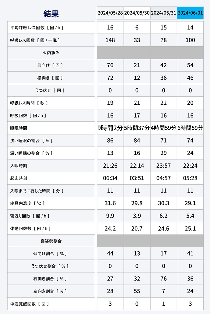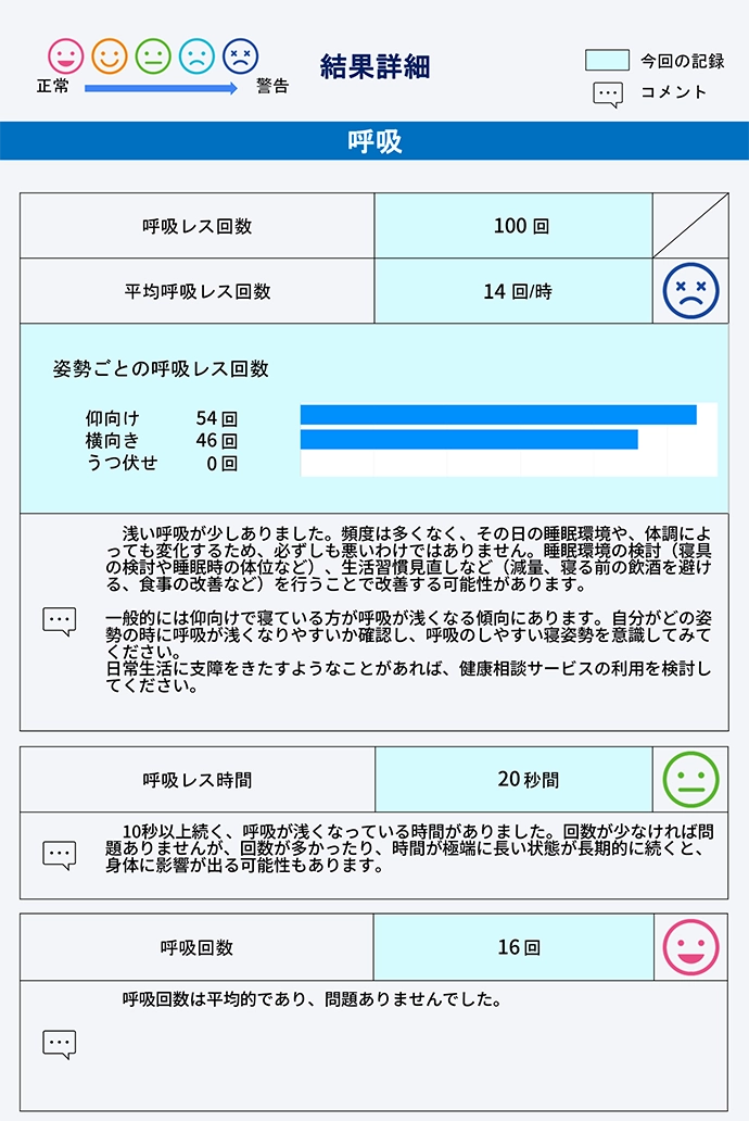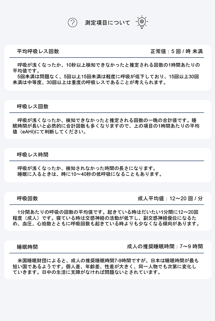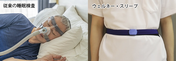 従来の睡眠検査だと、1泊2日で3万~5万の費用が必要で、機器をいくつか取り付けるため身体にも負荷がかかり、定期的な検査は難しいですが、ウェルネー・スリープなら、自宅で就寝時に服の上から巻いて寝るだけなので、身体への負担も少なく、定期的な変化を確認することができます。