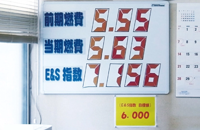 デジタコの速度データを基に自動算出されるE&S指数(エコ&セーフティ:実際の走行速度と理想の速度を比較して指数化したもの)を活用し、前日のランキングと週間運転成績表を事務所に掲示しています。