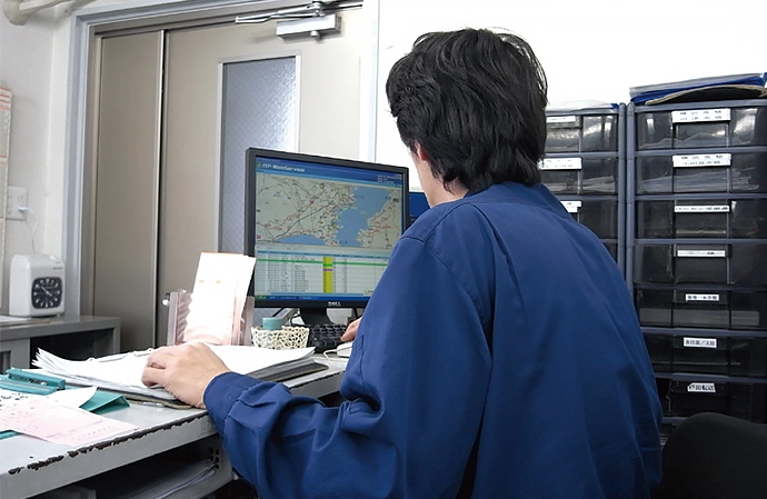 ネットワーク型デジタコなら、画面で配送状況を確認できるので、手間なくスピーディ。急な出荷や行き先住所などは、運行中の車両にメッセージ送信。用件を即座に伝えられ、お客様にも満足いただいています。