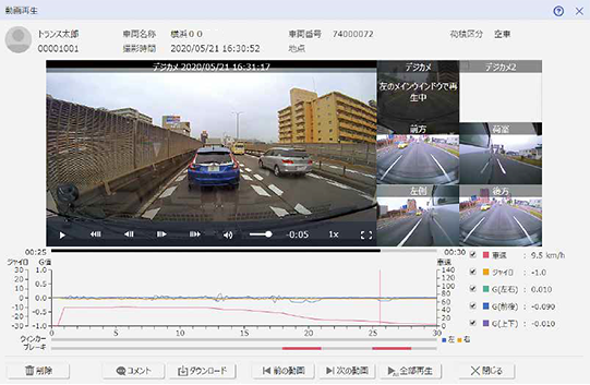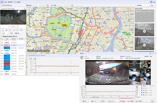 - 急ブレーキなど危険運転をアラート、安全運転指導を行える。