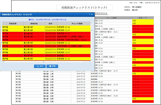 - 運行データから勤務時間を自動計算、長時間運転防止。