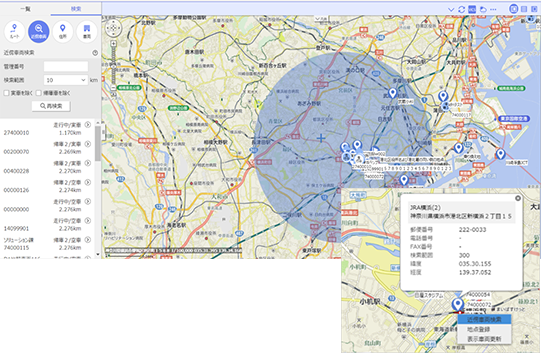 ITP-WebService V3は、近傍車両を検索して効率的な配車を行えます。ITP-WebService V3の地図上で右クリック「近傍車両検索」を選択。そこから近い車両を検索し、指定地点からの距離を表示します。