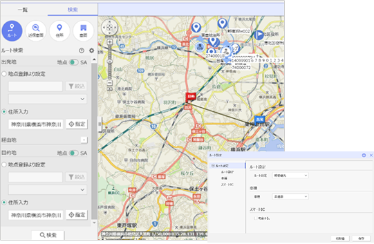 出発地と目的地(経由地の指定可)からルート検索ができます。時間優先/距離優先・軽自動車/普通車/中型/大型/特大など、検索条件に沿ったルート・距離・時間・料金を表示します。ルートは印刷可能。