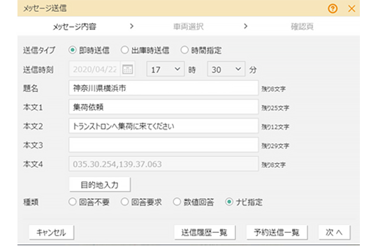 事務所(ITP-WebService V3)と車両(デジタコ DTS-G1)間でテキストメッセージの送受信ができます。回答要求を選択すると車両側から「はい/いいえ/数字」で回答が行えます。車両走行中は受信メッセージを自動で読み上げます。