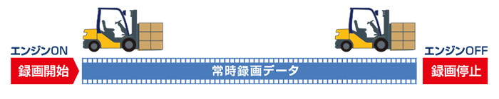 フォークリフトのエンジン始動~停止まで、連続して映像を録画し、SDカードに記録します。フォークリフトのエンジンと連動なので、FDR-810の電源をON/OFFする必要はありません。