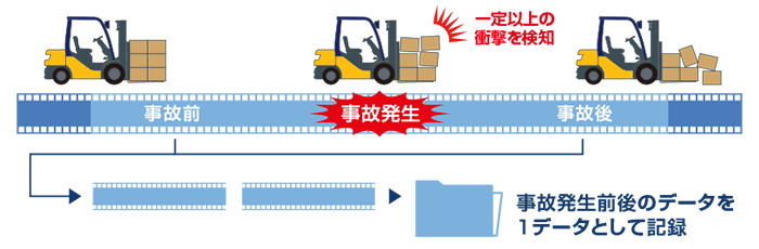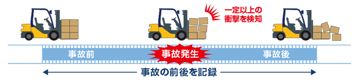 フォークリフト独特の挙動に対応したGセンサー・ジャイロセンサーが、一定の衝撃を検知した場合にのみ、事故発生前後の映像を録画し、SDカードに記録します。イベント記録時には、ビープ音が鳴り、記録が行われます。