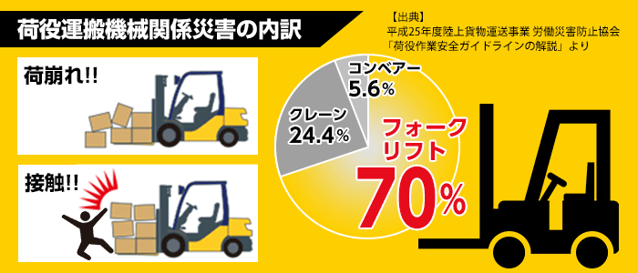 荷役運搬機械関係の災害発生件数の内、約70%はフォークリフトによるものです。