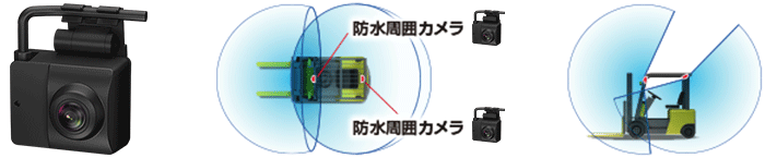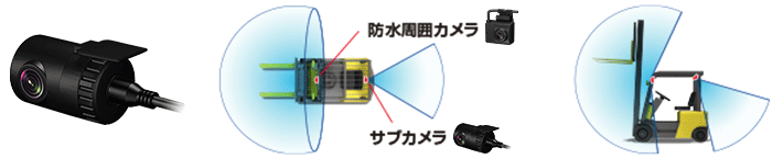 付属の防水周囲カメラは、360°全方位カメラなので、フォークリフトの周囲状況を1台で記録できますが、どうしても生じてしまう死角を2台目のカメラで補えます。