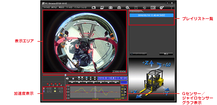 付属の専用ブラウザソフトを使うと、FDR-810のカメラ映像やセンサー検知の詳細など、簡単に確認できます。表示エリアの映像は、拡大・縮小可能。検索機能により、膨大な記録データから注目したいデータを抽出することもできます。
