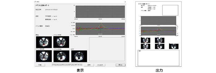 | 常時録画 | 日時/運転時間/衝撃の発生回数/加速度グラフ |