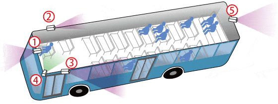 カラーカメラ、赤外線カメラに対応。車両の前後左右、運転状況や車内の様子、ドライバーの死角など、最大5台のカメラを接続できます。ドライブレコーダーの映像は、解析ソフトで5台同時再生が可能です。