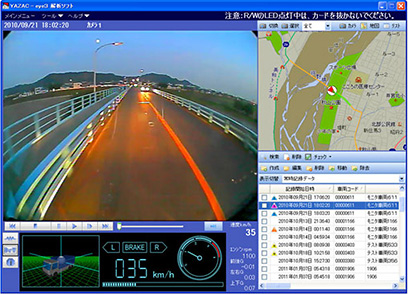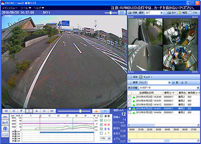 YAZAC-eye3で記録された情報と画像データ、速度/エンジン回転数/加速度などのセンサーグラフを表示します。最大5台のカメラ映像を再生できます。