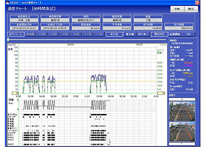 Yazac-eye3で記録したデータを用いて、速度チャートを表示します。速度チャートは「安全運転日報」にも出力されます。