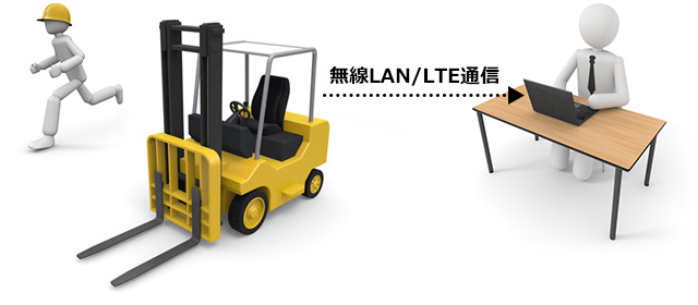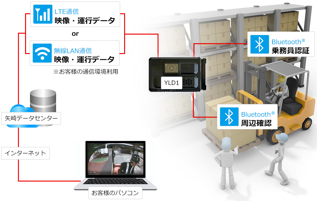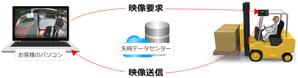 フォークリフトに取付けたYLD1に対し、事務所のパソコンから閲覧したい映像データを矢崎データセンターを経由して要求できるため、緊急性が高い場合や管理者が遠隔地にいる場合でも、必要な映像を確認することができます。