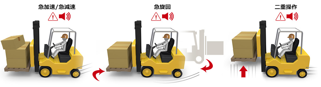 Gセンサー・ジャイロセンサーで「急加速」「急減速」「急旋回」「二重操作(走行中のリフト操作)」を検知すると、警報を鳴らし、注意を促し、記録します。