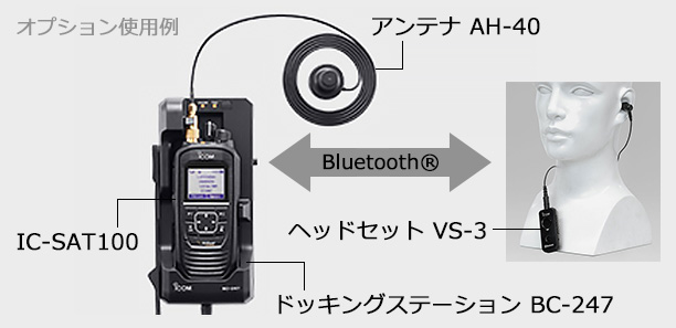 オプションの「アンテナ AH-40」を接続することにより、屋内や車内でも衛星通信が利用できます。IC-SAT100には、Bluetooth®が搭載されていますので、走行中もハンズフリー通信ができます。