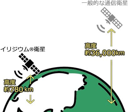 イリジウム®衛星は、高度約780kmと低軌道を周回するため、一般的な通信衛星と比べ、音声遅延の少ない、リアルタイムな通信が可能。イリジウム®の衛星ネットワークにより、北極・南極を含む地球全体をカバーします。