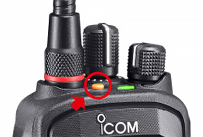 IC-SAT100のアンテナ近くにあるオレンジ色のボタンが、緊急呼び出しボタンです。ボタンを長押しすることで、あらかじめ設定した端末に緊急呼び出しを一斉送信します。