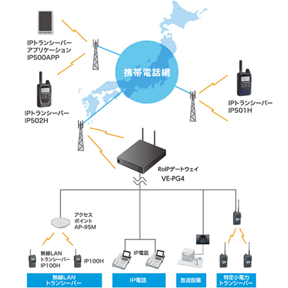 IP500APPは、通信拡張ユニットVE-PG4(オプション)を利用することで、従来のIP無線機や簡易無線機、特定小電力無線機、IP電話などと相互通話が可能です。