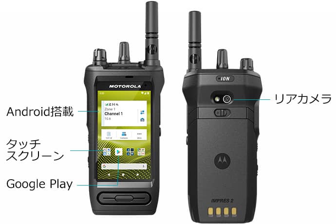 免許不要(IP)/免許(一般)LTE/UHF/Wi-FiGPSAndroidカメラBluetooth®4W/1W4GB RAM32GBゴリラガラスUL防爆仕様防塵防水IP68