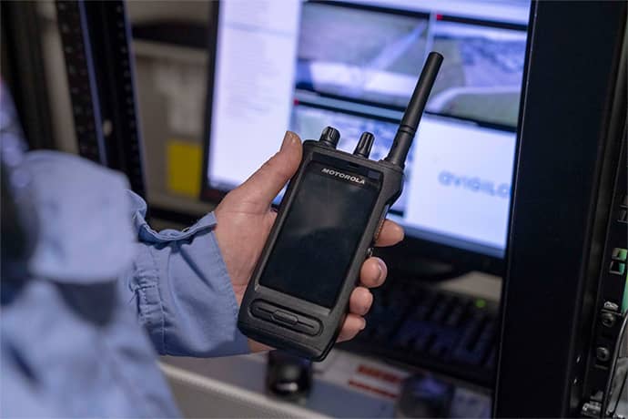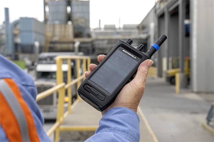 現場映像をリアルタイムに共有。音声もビデオチャットなどのデータ通信も1台に集約。セキュリティ性の高い無線機。