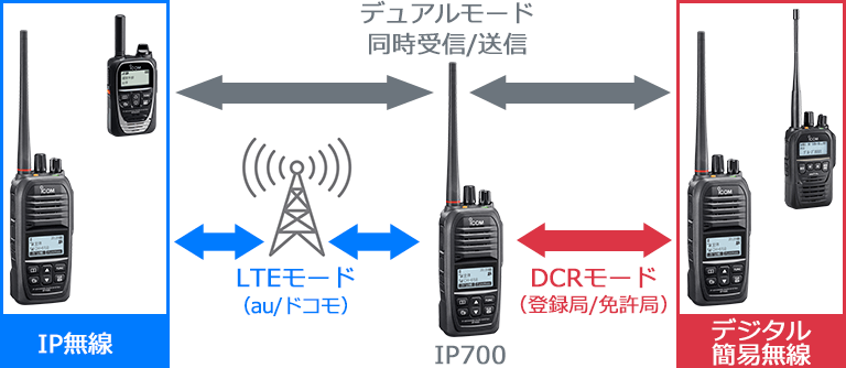 IP700 PLUS ハイブリッドIPトランシーバーは、「LTEモード(IP無線 au/ドコモ)」「DCRモード(デジタル簡易無線 登録局/免許局)」「LTE+DCR」両方の受信/送信を同時に行なうことができるデュアルモードの3つのモードを備えた無線機です。