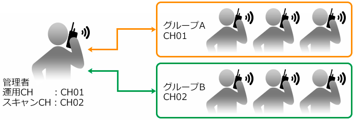 - セカンダリPTT:スキャンチャンネル「CH02」で「グループB」と通信。