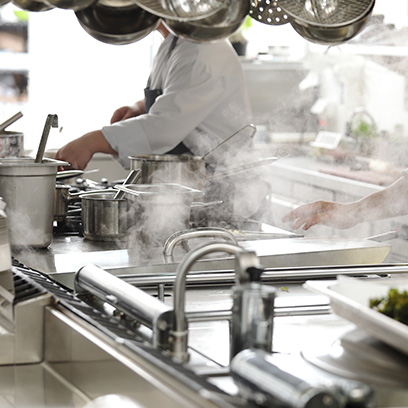たとえば、ホテルのレストランなどでは、無線機を使って料理出しのタイミングを連携することにより、効率よく動けるようになり、お客様にも最適な温度で料理を提供できます。
