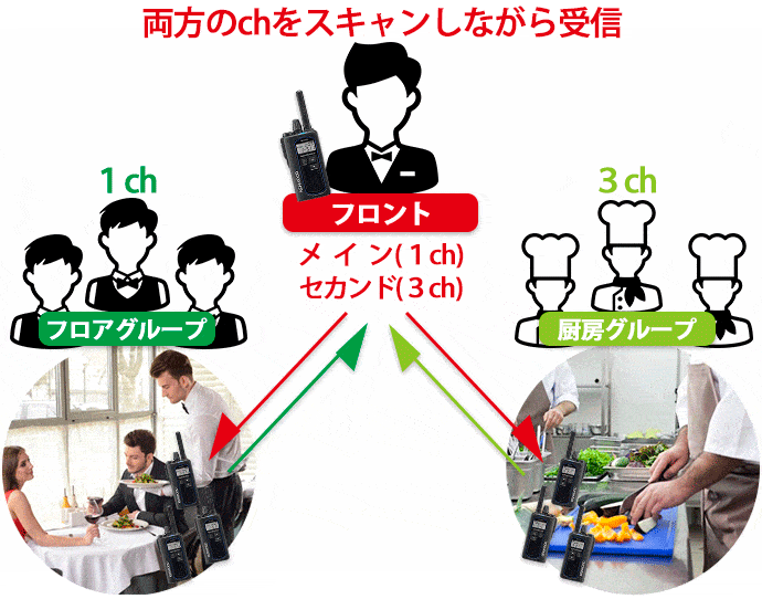 セカンドPTT機能とは、無線機1台で2つのチャンネルの待受・送信ができる機能です。メインで使用するチャンネルの他に、もう1つのセカンドチャンネルで待受・送信することにより、1台で2台持っているような運用が可能。たとえば、ホテルのレストランで、フロントからフロアのグループ「1chを使用中」と厨房のグループ「3chを使用中」に別々の指示を出したい時など、「1chと3ch」両方のチャンネルと通話ができて便利です。※同時送受信は非対応。