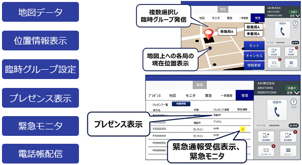 地図上で移動局の位置確認や複数の移動局を任意に選択して、臨時グループを呼び出すことができます。また、移動局の通信モニタなど、的確な情報共有が可能です。