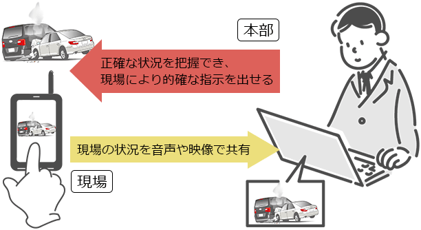 災害時やトラブル発生時、現場の状況を音声や映像で共有できます。本部は正確な状況を把握でき、現場により的確な指示を出すことが可能です。