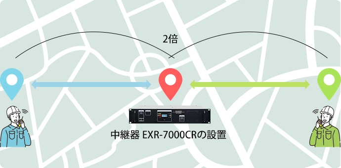 これまで通信が届かなかったエリアもデジタル簡易無線機 免許局の無線機同士の中間地点にEXR-7000CRを設置することにより、中継装置を介しての通信となり、通信距離が約2倍に拡張します。