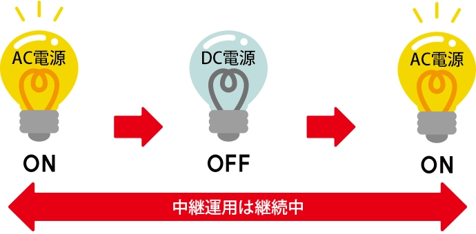 EXR-7000CRは大容量のAC電源を内蔵、別途電源を用意する必要がありません。また、停電時にはバックアップ用DC電源に自動で切替わり、中継運用を継続。停電復旧後には、AC電源に自動で切替わり、通常運用に戻ります。
