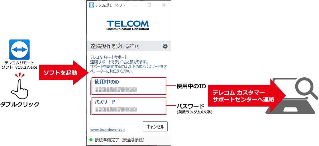 - ソフトを起動し、表示された使用中のIDとパスワードをテレコムのカスタマーサポートセンターへご連絡ください。