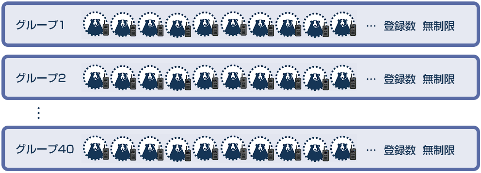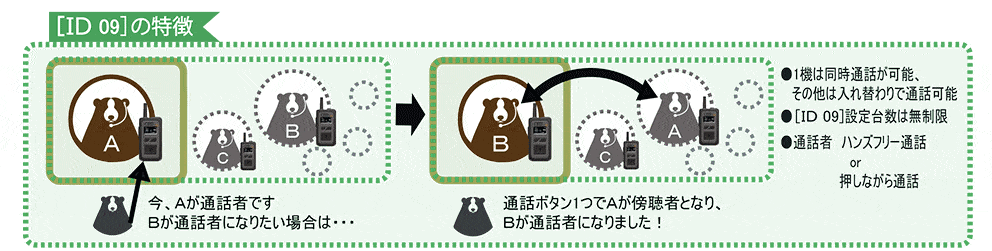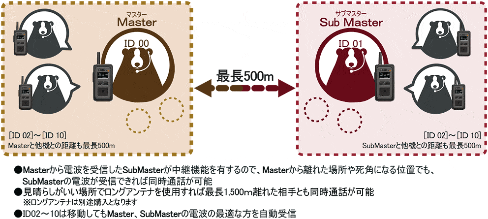 同時通話最大10人、傍聴人数は無制限。中継機能を使えば最長1500mまで通話可能なトランシーバー。